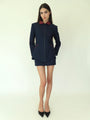 A navy jacket and skirt set featuring sharp tailoring, a rich burgundy collar, and matching trim details clean, modern, and effortlessly chic